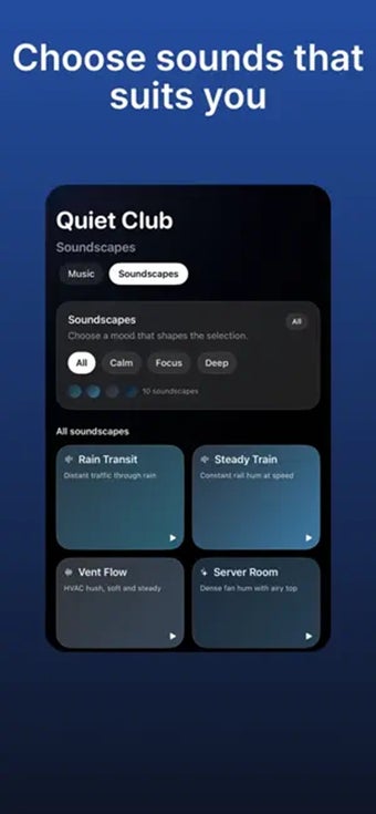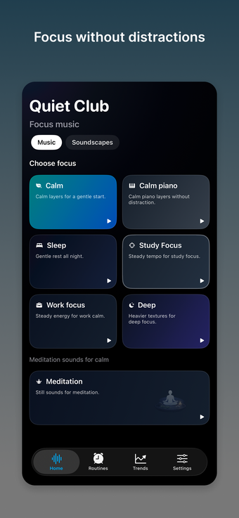 QuietClub: Fokus & Sömn Ljud riktar sig till personer som lätt blir distraherade, tenderar att överanalysera eller har symptom på ADHD genom att erbjuda fokusförbättrande ljud upplevelser utan prat, annonser eller visuellt kaos, vilket gör att de kan komma in i ett produktivt eller lugnt tillstånd snabbare—oavsett om de studerar, arbetar, läser eller försöker koppla av.